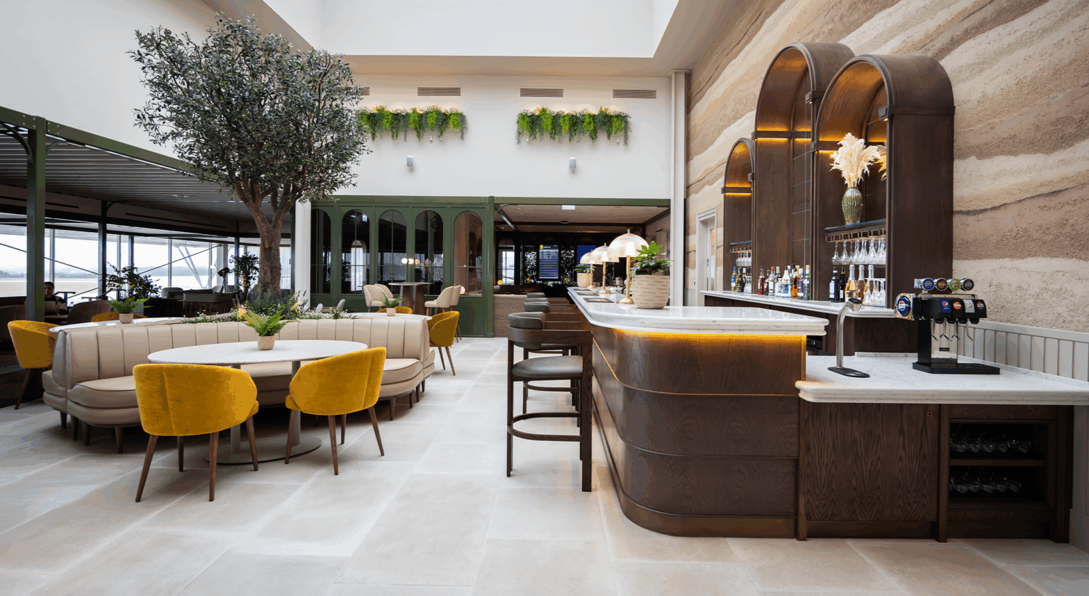 The lounge layout maximises views of the runway and sea, blending indoor comfort with a strong connection to the outdoors. Key spaces — including The Orangery, Library, Bistro, and Bar Lounge — offer varied atmospheres that balance calm retreat and social energy. Together, these elements create a modern interpretation of a local manor and gardens, delivering a sophisticated yet intimate environment that embodies No1 Lounges’ philosophy of curated comfort and authentic sense of place.
