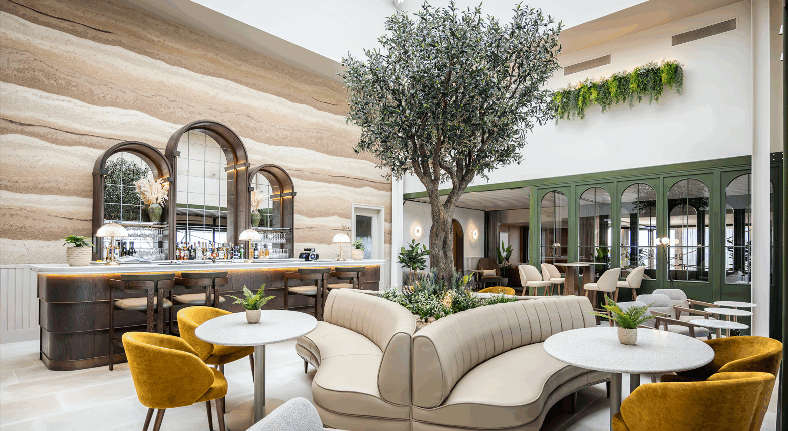 The design approach combines natural materials and tactile finishes to evoke warmth and familiarity within a refined setting. Oak panelling, limestone paving, granite accents, and earthen clay surfaces establish a palette inspired by the island’s landscapes, complemented by soft, organic geometry and greenhouse-like structures.